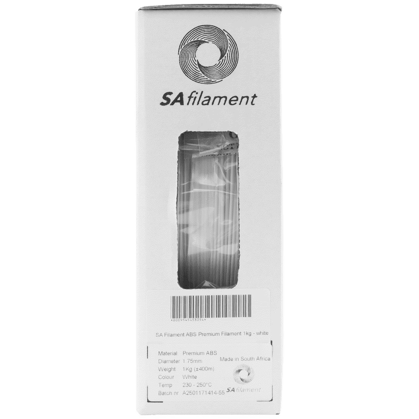 Upgrade your 3D prints with SA Filament Premium ABS – a high-performance, locally engineered filament designed for strength, heat resistance, and consistency. Whether you’re creating functional prototypes, mechanical parts, or aesthetic models, this ABS delivers professional results print after print.Manufactured in South Africa using advanced automation and quality control, each 1.75 mm spool is vacuum-sealed to protect against moisture and preserve quality. With tight diameter tolerances and reliable extrusion, this ABS filament 1 kg roll ensures smooth, accurate printing and dependable performance.Choose SA Filament for a durable, cost-effective solution that puts 3D printing excellence within reach for South African hobbyists and professionals alike.
